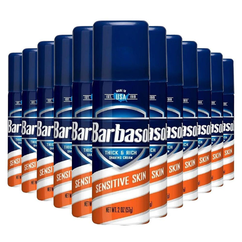 Barbasol Thick & Rich Shaving Cream for Sensitive Skin: Stock up on a soothing shave with this bulk pack of Barbasol's sensitive skin shaving cream. Ideal for wholesalers, this 24-pack of travel-sized cans provides a gentle yet effective shave for men with sensitive skin. Formulated with aloe, thyme, papaya, and willow bark, this cream offers a close shave while hydrating and protecting delicate skin.