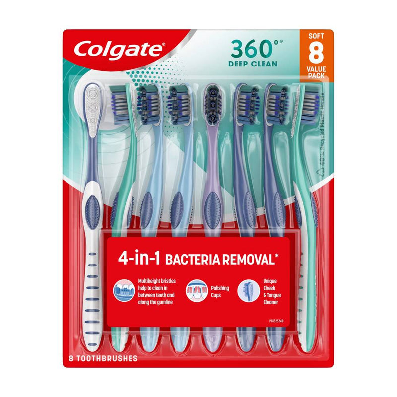 Upgrade your daily oral hygiene with Colgate 360 Whole Mouth Clean Manual Toothbrushes. Designed for a full-mouth clean, this 8-pack features soft bristles and unique cleaning elements that reach teeth, cheeks, tongue, and gums.
