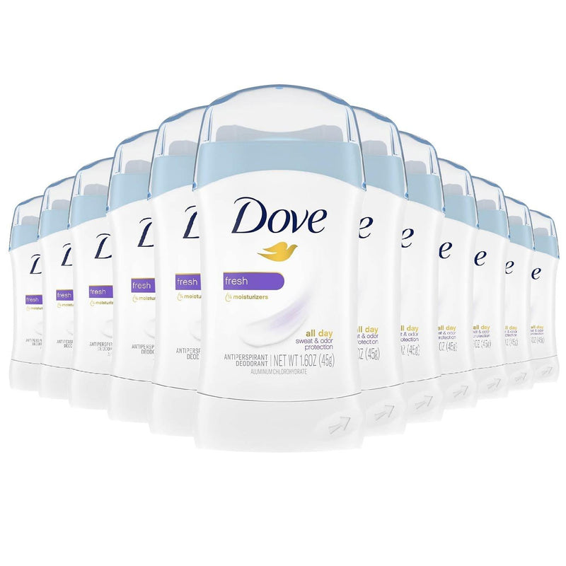Dove Invisible Solid Antiperspirant & Deodorant Stick Fresh, 1.6 Oz - 12 Pack. Stay fresh and confident all day long with Dove Invisible Solid Antiperspirant & Deodorant Stick Fresh. This deodorant is formulated with ¼ moisturizers to help keep your underarm skin feeling soft and smooth. It provides 48-hour protection against sweat and odor, and it goes on clear, so you don't have to worry about white marks. Plus, it has a light and refreshing scent that will keep you feeling fresh all day long.