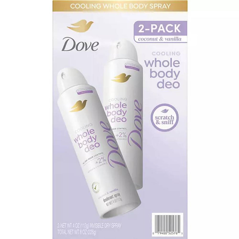 Stay fresh from head to toe with Dove Whole Body Cooling Deodorant Spray. This 2-pack of 4 oz sprays is specially formulated for underarms, chest, thighs, and other body areas, delivering all-over freshness and 48-hour odor protection. Infused with cooling agents and skin-loving ingredients, Dove’s gentle formula is alcohol-free, dermatologically tested, and leaves skin feeling soft, soothed, and clean. Ideal for daily use, this spray is a must-have for active lifestyles.