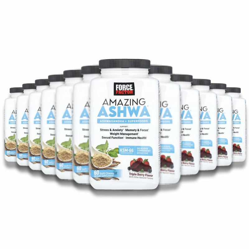 Force Factor - Amazing Ashwa, Triple Berry, Ashwaganda Supplement, Bottle - 60 Soft Tablets - 12 Pack