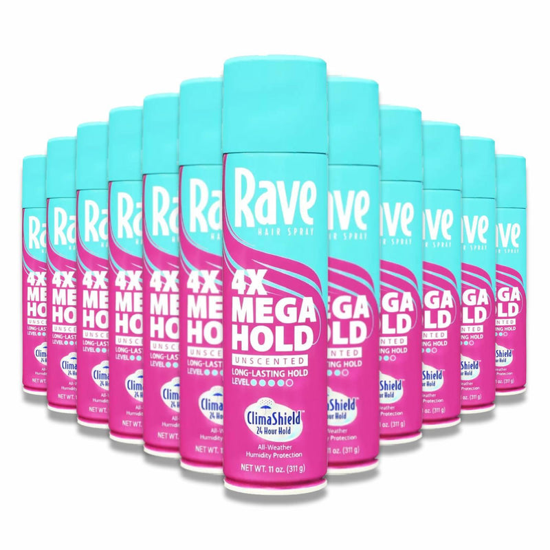 Rave 4X Mega Unscented Hair Spray: The Ultimate Hold for Any Style. Looking for a hairspray that can hold your style through anything? Look no further than Rave 4X Mega Unscented Hair Spray. This professional-strength formula provides long-lasting hold without the stiffness or stickiness. Perfect for all hair types, our unscented hairspray is ideal for those who want a strong hold without any added fragrance. This 12-pack is perfect for salons, barbershops, or anyone looking to stock up on a hairspray they can trust.