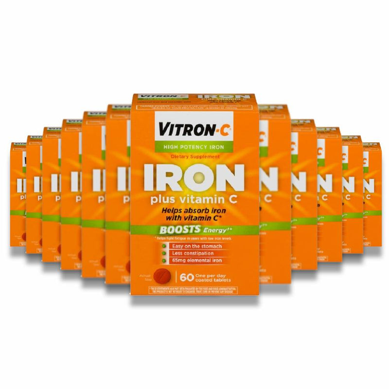VITRON-C High Potency Iron Supplement provides essential iron (65 mg of elemental iron) combined with Vitamin C (125 mg) to enhance absorption and reduce iron deficiency fatigue. Each bottle contains 60 tablets, making this 12-pack ideal for long-term use or bulk purchase.