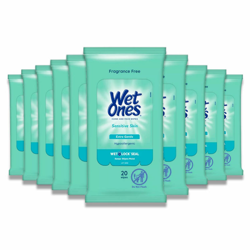 Wet Ones - Sensitive Skin Hand Wipes Travel Pack, Fragrance Free - 20 Ct - 10 Pack