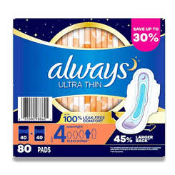 Always - Ultra Thin Size 4 Overnight Pads With Wings, Unscented - 80 Ct