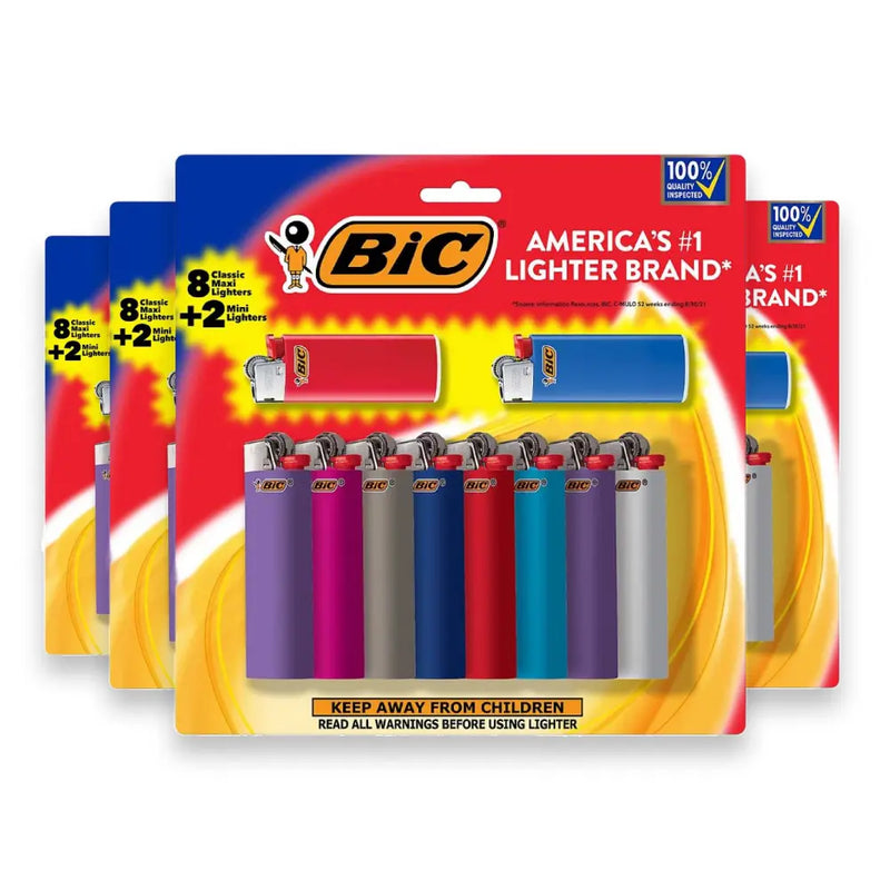 Product Description: This is a listing for a wholesale lot of the popular BIC Pocket Lighters (8 Maxi with 2 Mini) - 4 Pack. This specific retail item is a bundled package of four (4) blister-carded retail packs, with each retail pack containing a total of 10 lighters: 8 BIC Classic Maxi Lighters (full size) and 2 BIC Mini Lighters (compact size). BIC lighters are famous for their safety, reliability, and long-lasting performance.