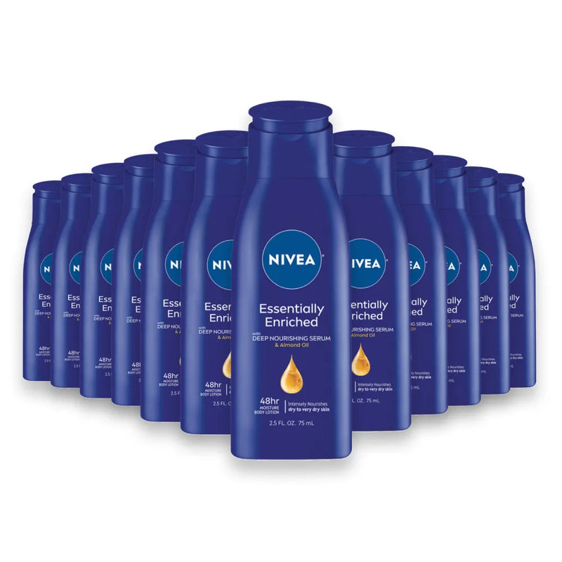 Offer your customers a travel-friendly solution for dry skin with this wholesale 24-pack of Nivea Essentially Enriched Body Lotion. Each 2.5-ounce bottle is a convenient, portable size, perfect for purses, gym bags, or for on-the-go moisturization. The rich, nourishing formula is infused with almond oil and NIVEA's Deep Nourishing Serum, providing long-lasting hydration and relieving even very dry, rough skin. This bulk offering is a high-demand item for convenience stores, travel shops, and pharmacies looking to provide a trusted skincare product in a practical size.