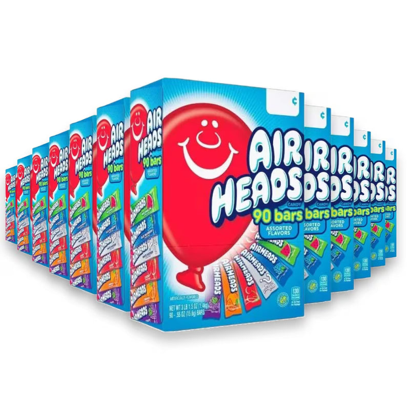 Capitalize on the impulse candy market and demand for bulk fun-size treats with this wholesale case of Airheads Variety Pack. Each inner carton contains 90 individually wrapped, assorted flavor bars (0.55 oz each), making them perfect for parties, vending machines, Halloween, or retail counter displays.