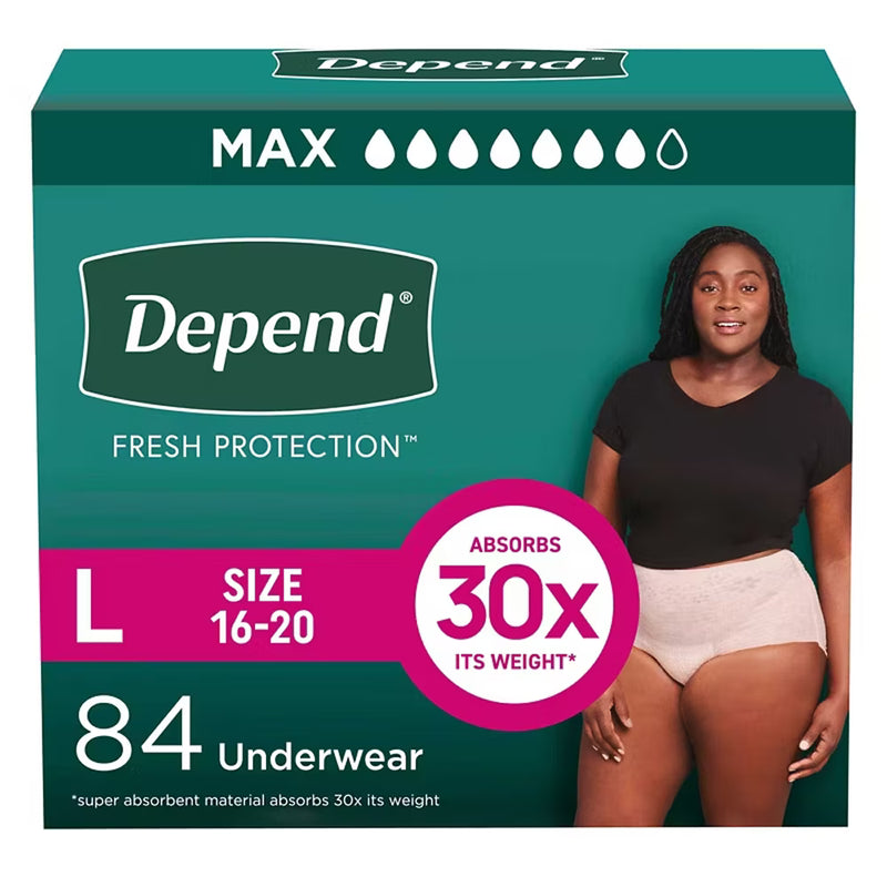 Depend Fresh Protection Adult Incontinence & Postpartum Bladder Leak Underwear for Women is a retail-ready personal care item designed to help manage bladder leaks with a discreet underwear-style fit. This configuration is Size Large (38–44 in waist) and supplied as an 84-count pack, making it suitable for wholesalers, retailers, and distributors that need dependable volume for recurring adult-care demand. The higher count format can reduce restocking frequency and help streamline backroom organization and replenishment routines across pharmacy, grocery, mass retail, and home-care supply channels.