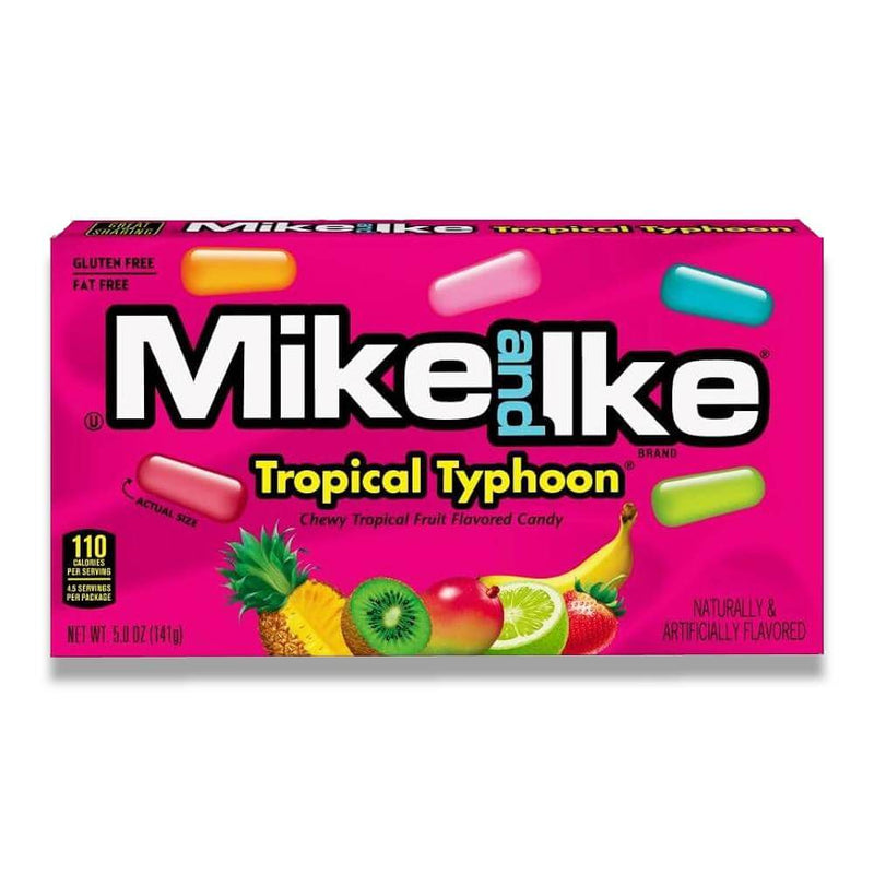 Mike & Ike - Tropical Typhoon - 0.78 Oz - 24 Ct. Embark on a Tropical Flavor Adventure with Mike & Ike Tropical Typhoon Candy. Get ready for a tropical flavor explosion with Mike & Ike Tropical Typhoon Candy. This 24-count box is packed with individually wrapped chewy candies in five exotic fruit flavors: Paradise Punch, Kiwi-Banana, Caribbean Punch, Strawberry-Banana, and Mango. Whether you're craving a sweet and tropical treat or simply love the taste of exotic fruits, Mike & Ike Tropical Typhoon Candy is sure to tantalize your taste buds and transport you to a tropical paradise.